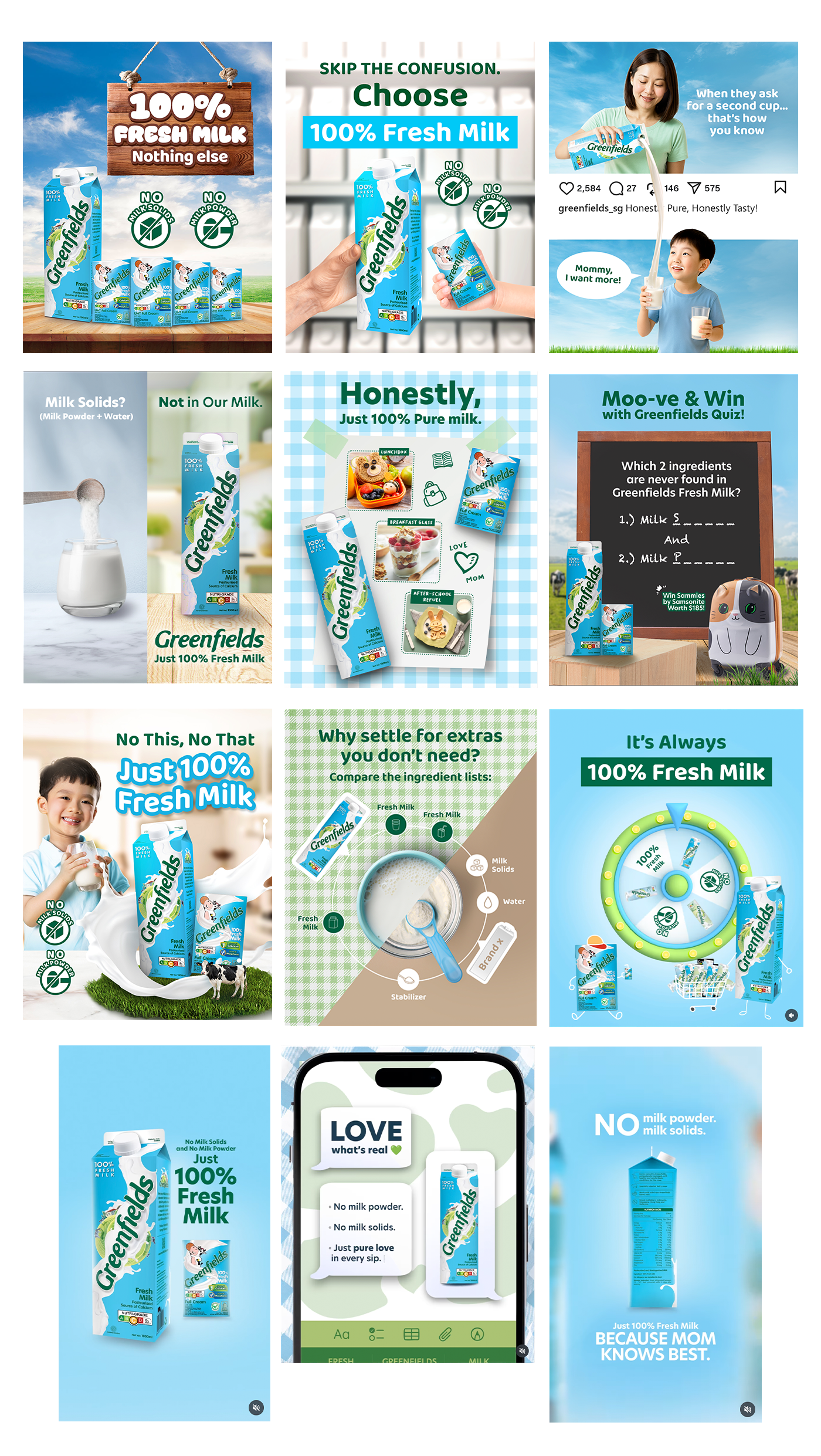 Greenfields’ simplicity became its edge. Instead of overwhelming consumers with details, we leaned into a single, direct line that communicated purity without overclaiming: “No milk powder. No milk solids. Just 100% fresh milk”.