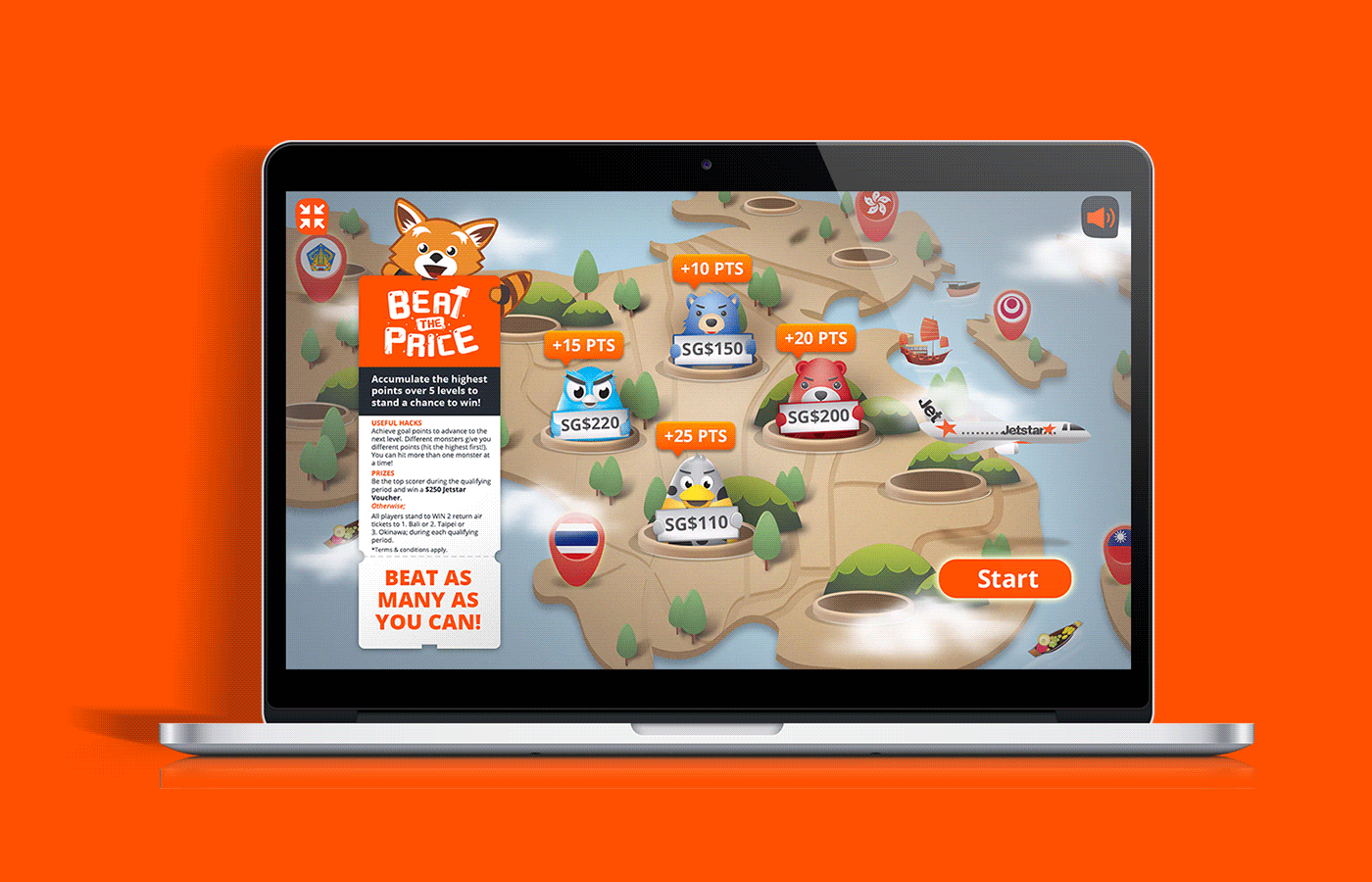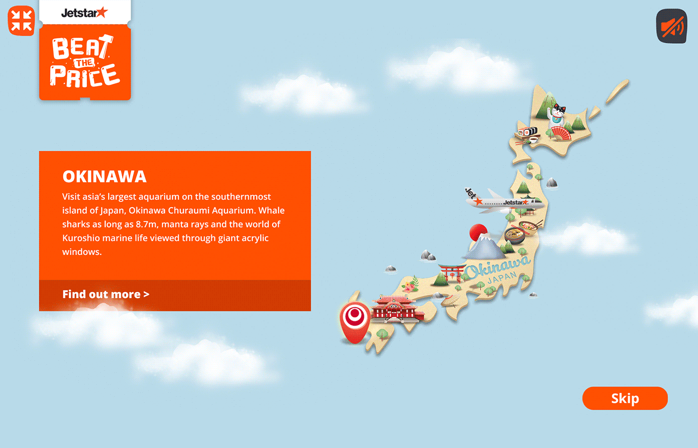 In aims of keeping consumers from choosing other airlines, the marketing objective was to maintain top-of-mind (TOM) awareness. Thus, Mashwire came up with an engaging game that allows users to be transported to various attractive tourist destinations during the game and inform users of the incredible price beat policy deal offered by Jetstar.